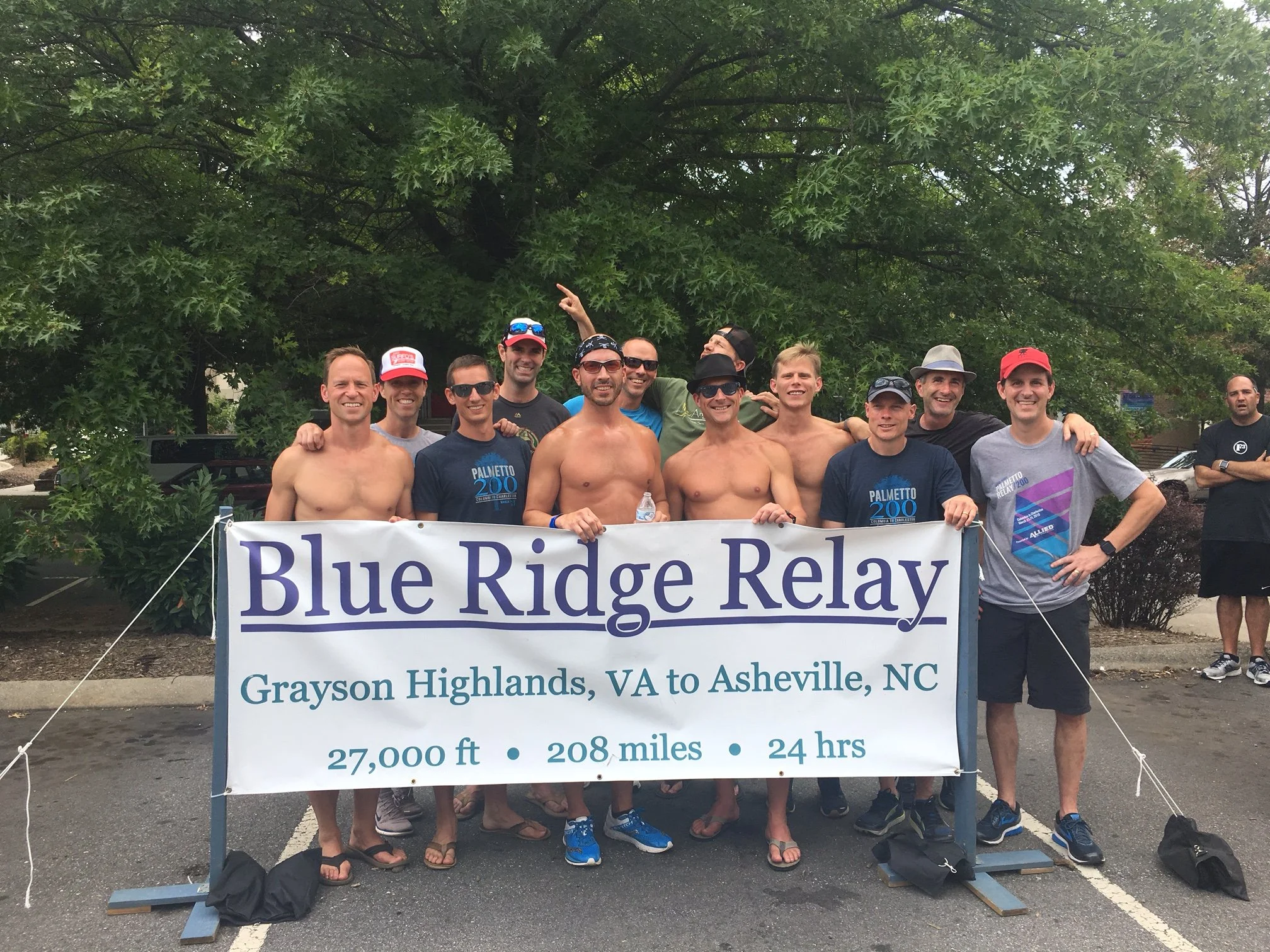 Group of people holding a banner that reads 'Blue Ridge Relay' with details of the race, including from Grayson Highlands, VA to Asheville, NC, covering 27,000 feet of elevation, 208 miles, in 24 hours, in a parking lot with trees in the background.