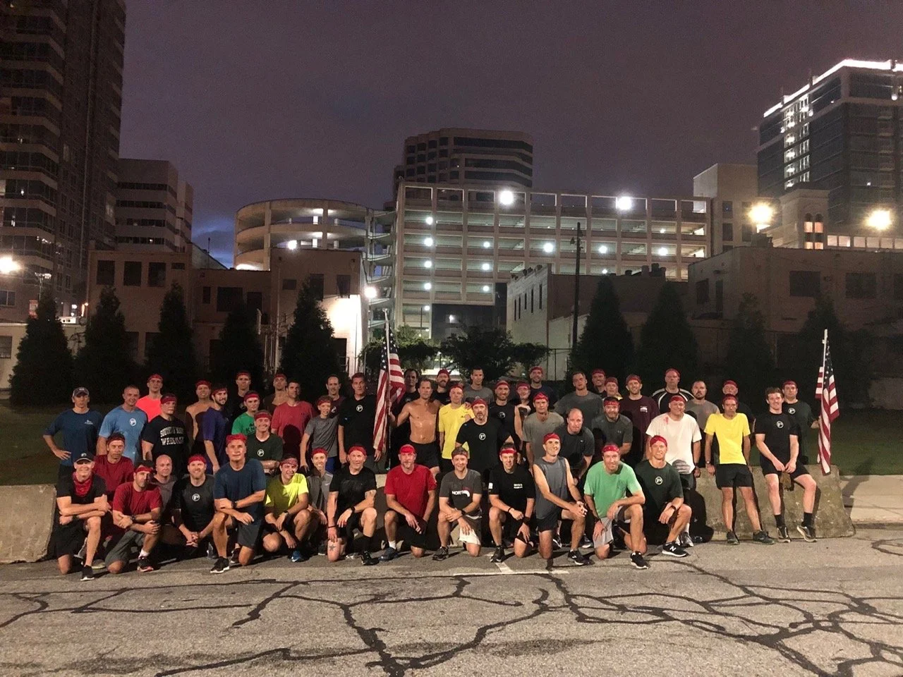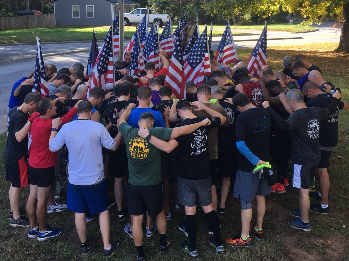 Group photo of people in workout gear posing outdoors, with text "4 Yr AO Annv - Deathstar F3 Greensboro" and F3 GSO logos.