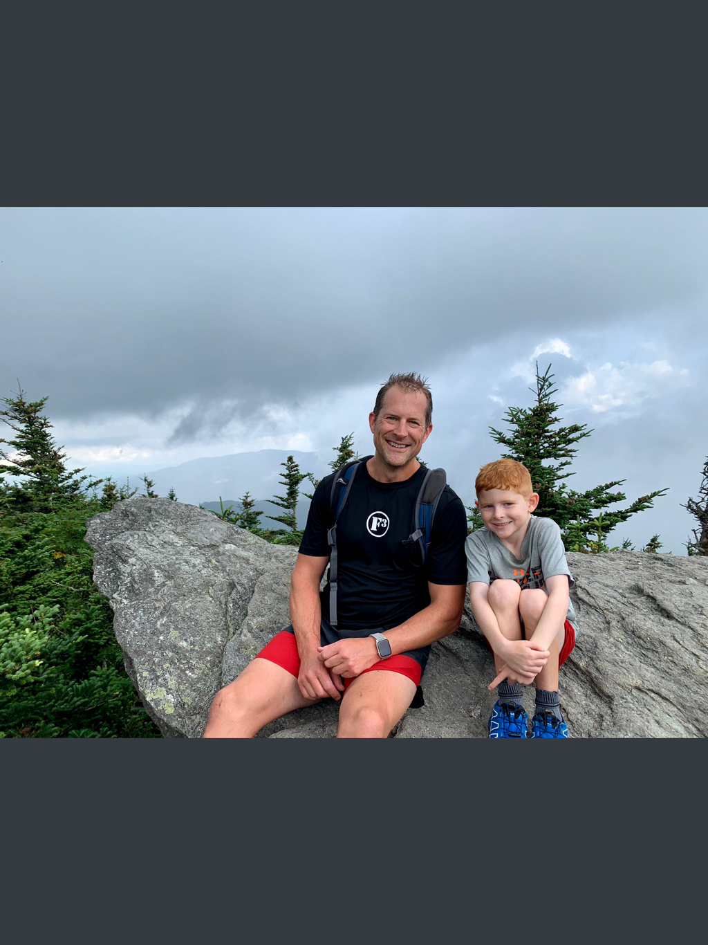 Man and boy hiking and sitting on a large rock on a mountain trail with trees and cloudy sky in the background.