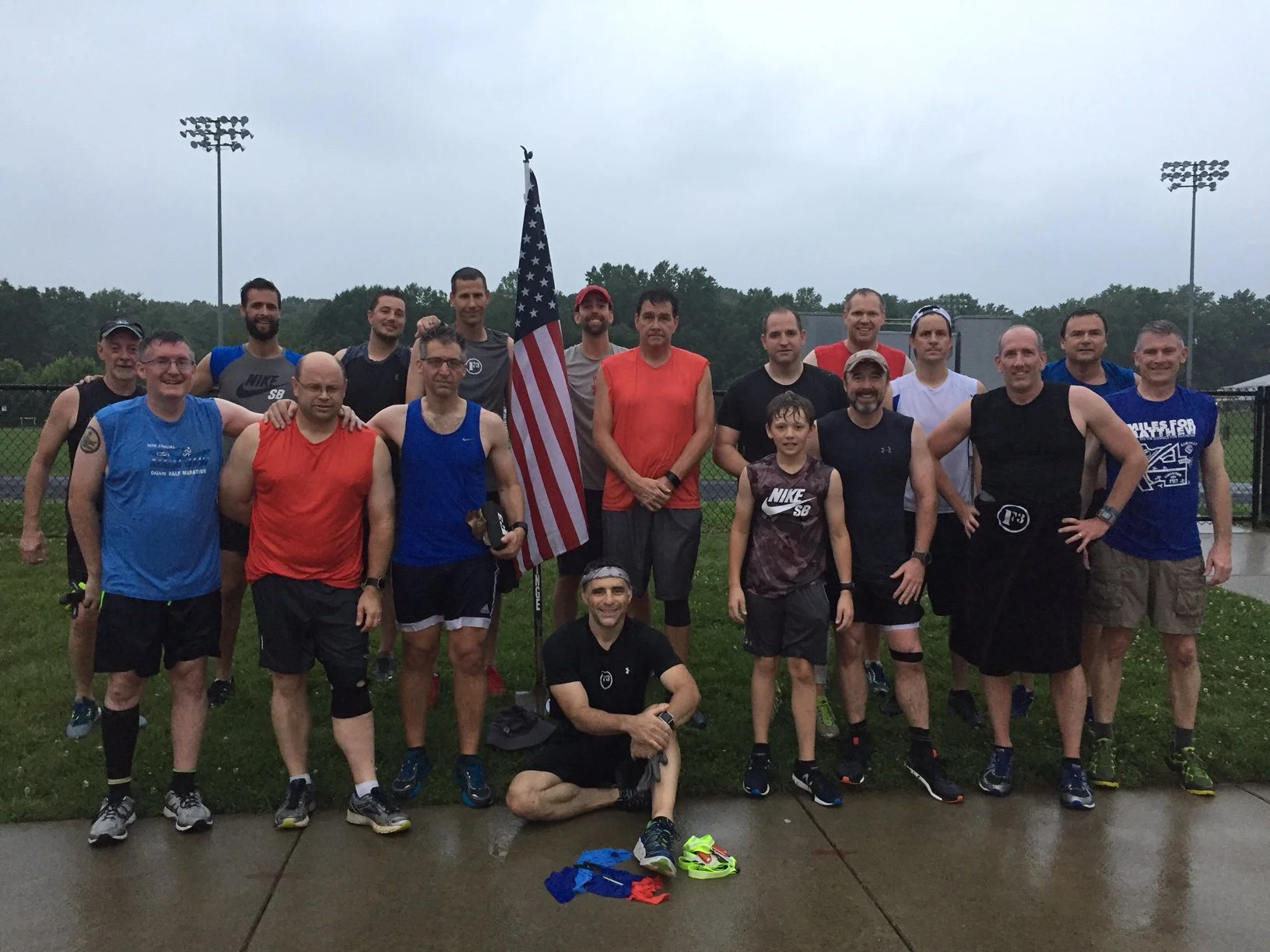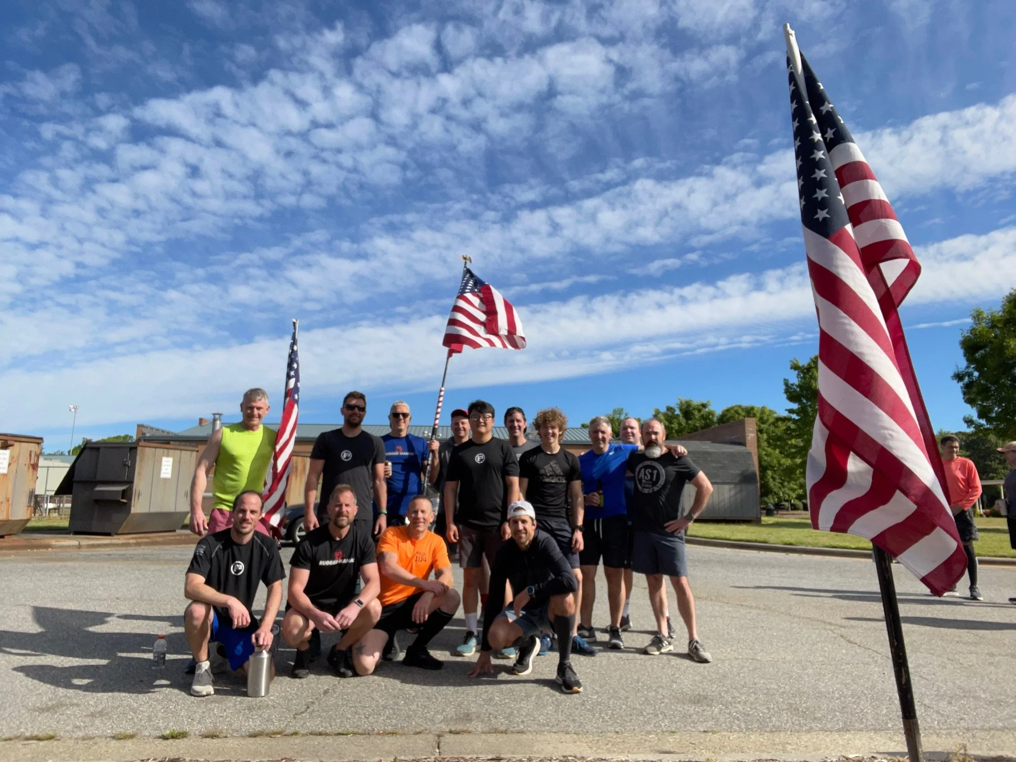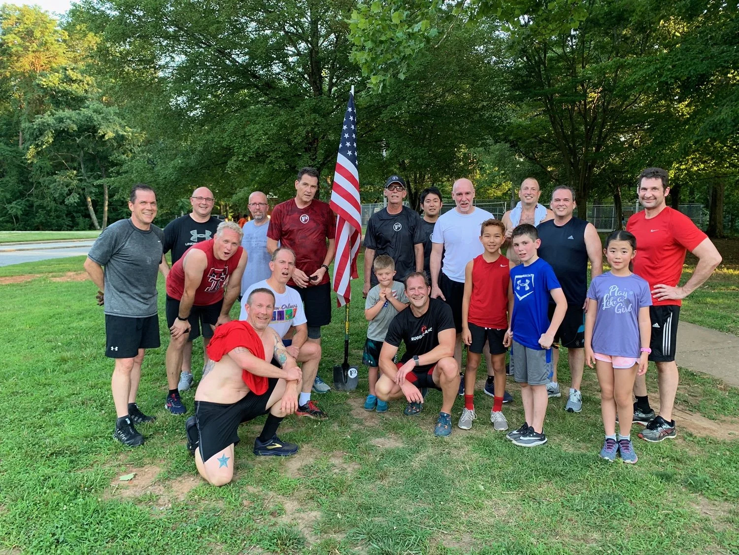 A group of people posing outside with an American flag, some wearing workout attire, in front of trees and a grassy area.