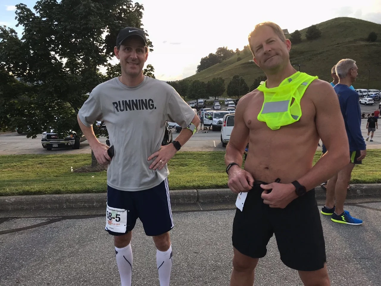 Two male runners at a park during sunset, one in a gray shirt with 'RUNNING.' printed on it, and the other shirtless with a yellow vest around his neck.