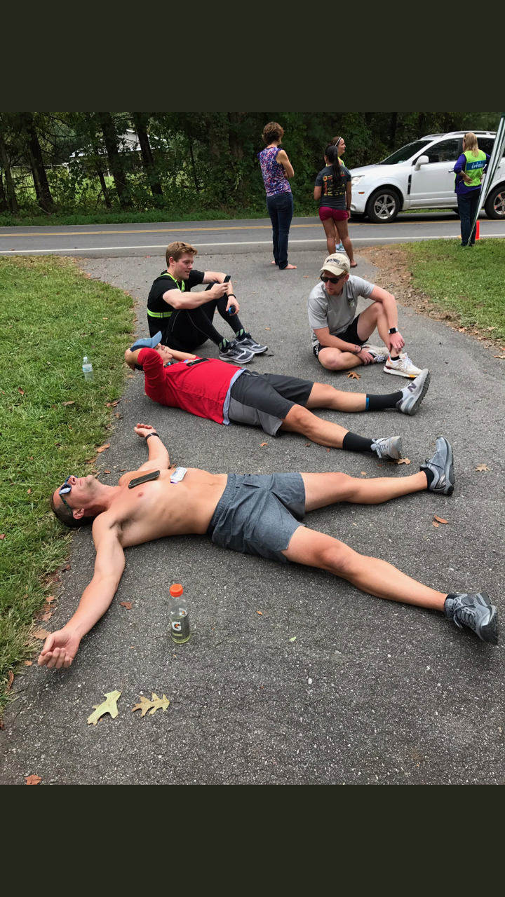 A man lies on the ground in a shirtless, athletic pose with sunglasses, a Gatorade bottle, and a phone nearby. Several other people sit or stand around him, some taking photos or talking, near a road with a wooded background.