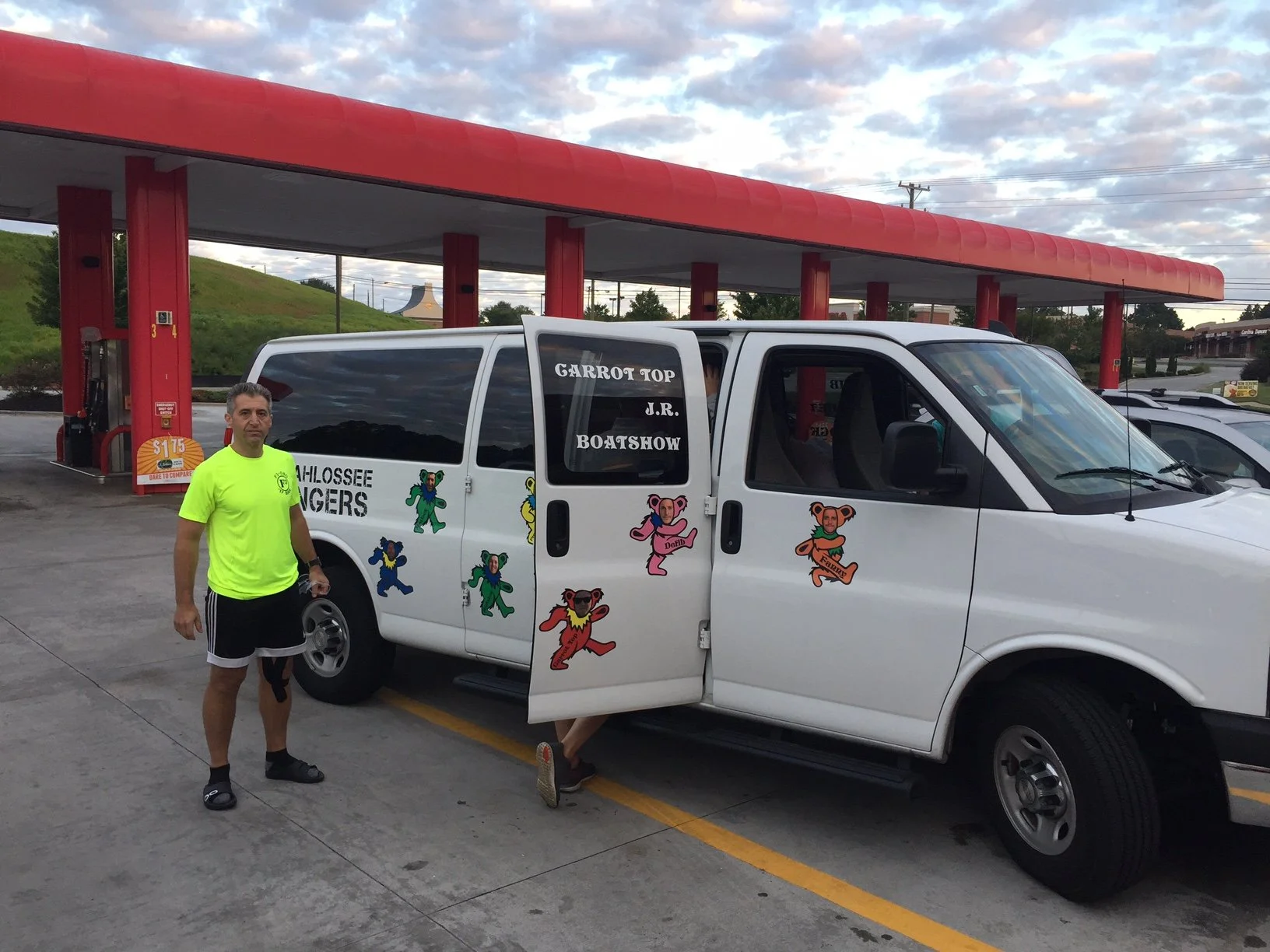 A man in a neon yellow shirt and black shorts standing next to a white van decorated with colorful cartoon bear stickers, parked at a gas station under a red canopy with an overcast sky.