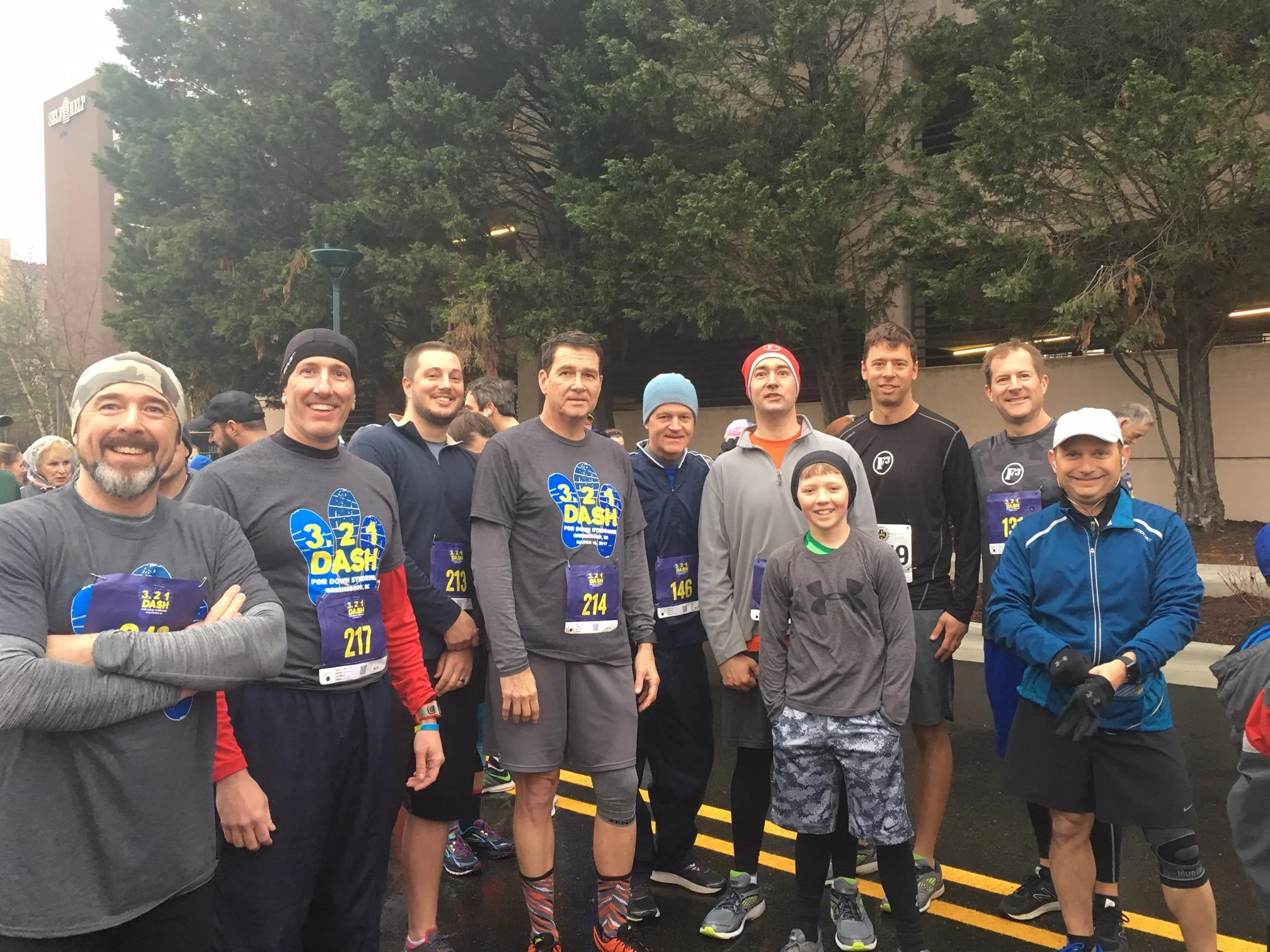 A group of men and a boy dressed in running gear, posing together at the start line of a marathon, with trees and other runners in the background.