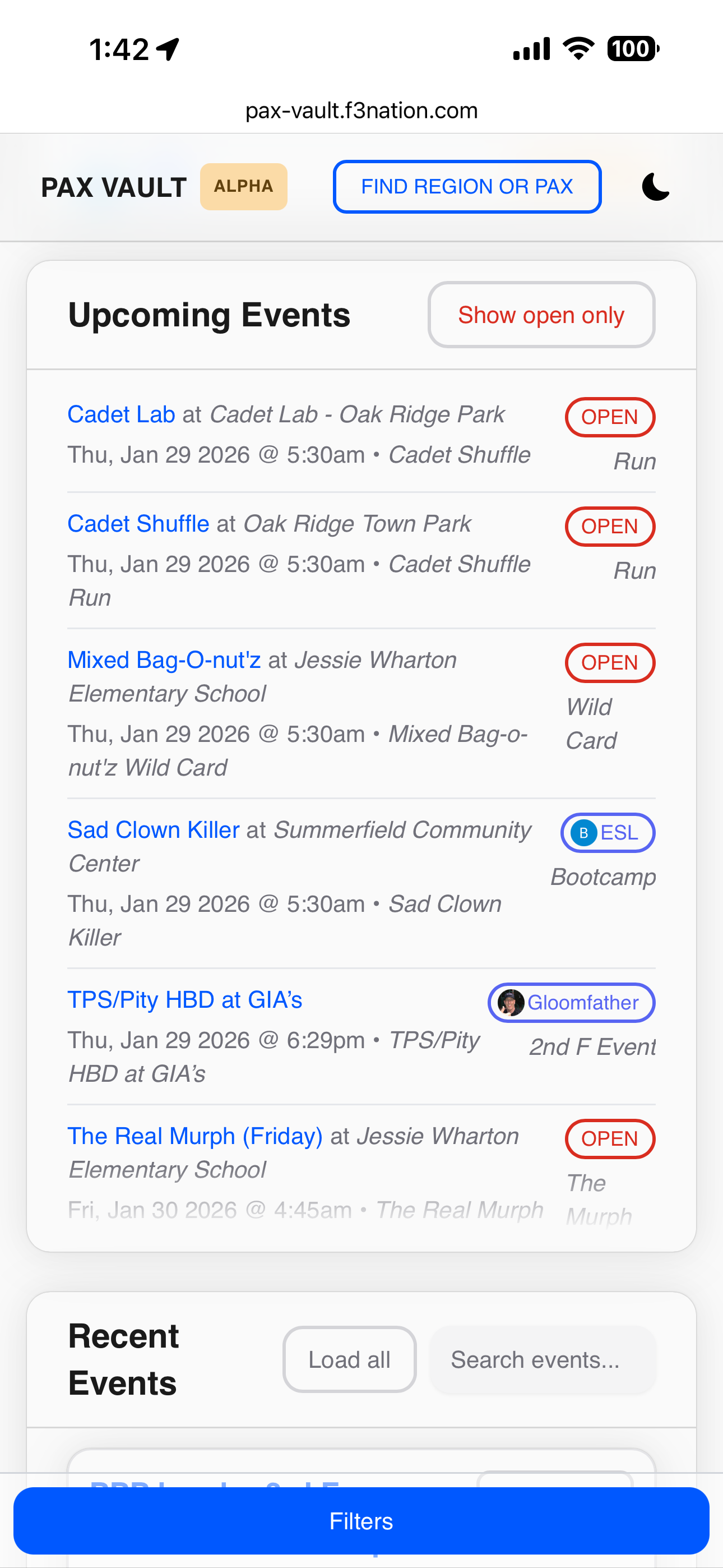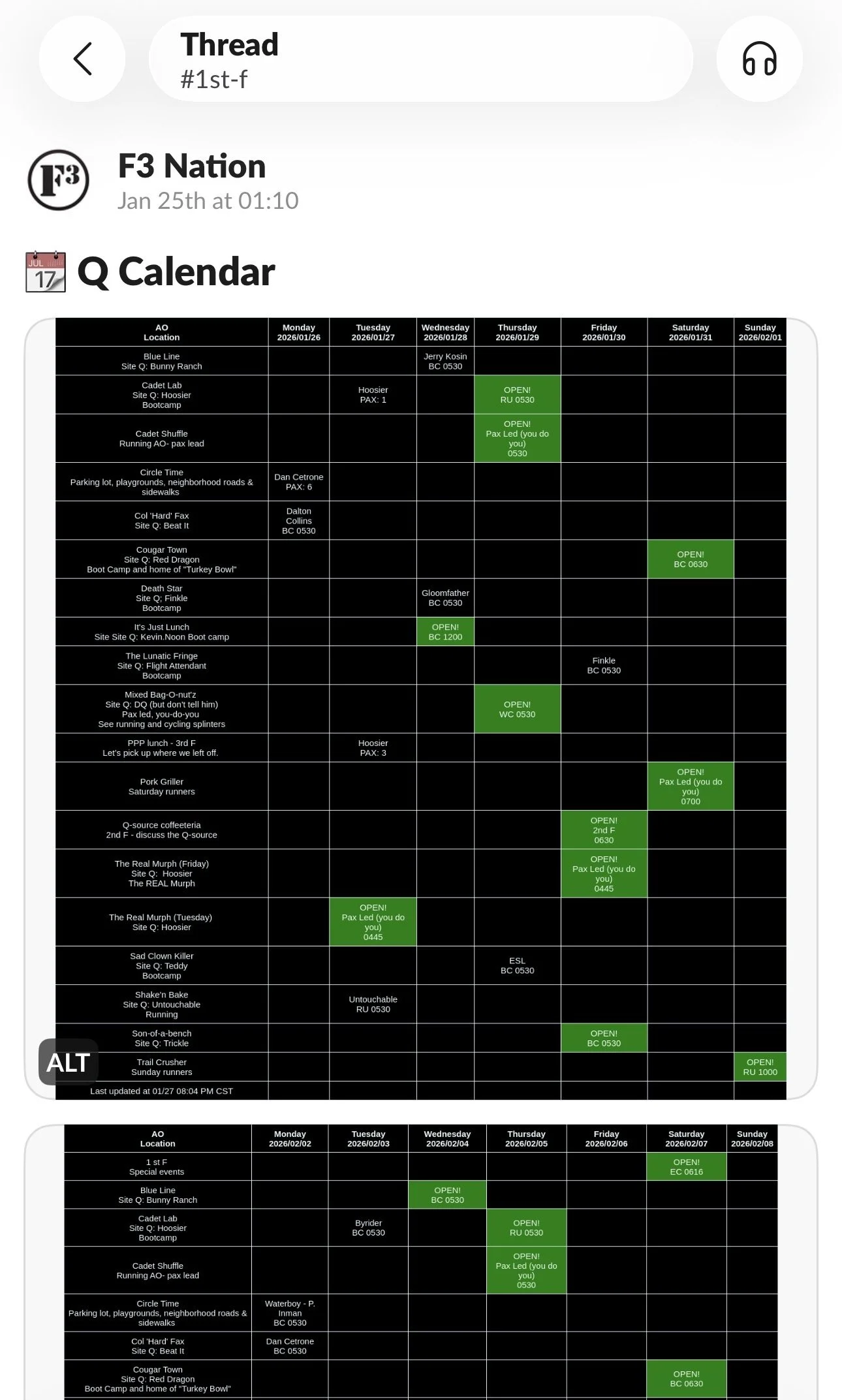 However, the easiest way to see the schedule in a broad view, is to use the Pax Vault link on the website: https://pax-vault.f3nation.com/stats/region/41182